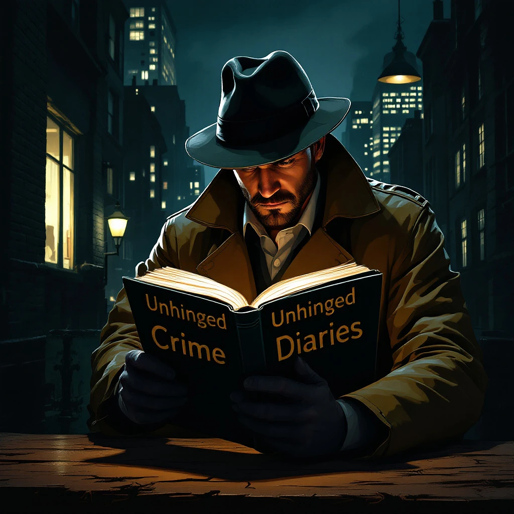 Male detective in a trench coat, set against a noir city backdrop at night, in the style of Edward Hopper, with moody, dramatic lighting and a sense of isolation. He is sitting at a table with reading a big book named “Unhinged Crime Diaries”. On the right side of the book. The words must be big and Visible. On the other side of the book cover it says “Confidential”--ar 71:128 --stylize 750 --v 6