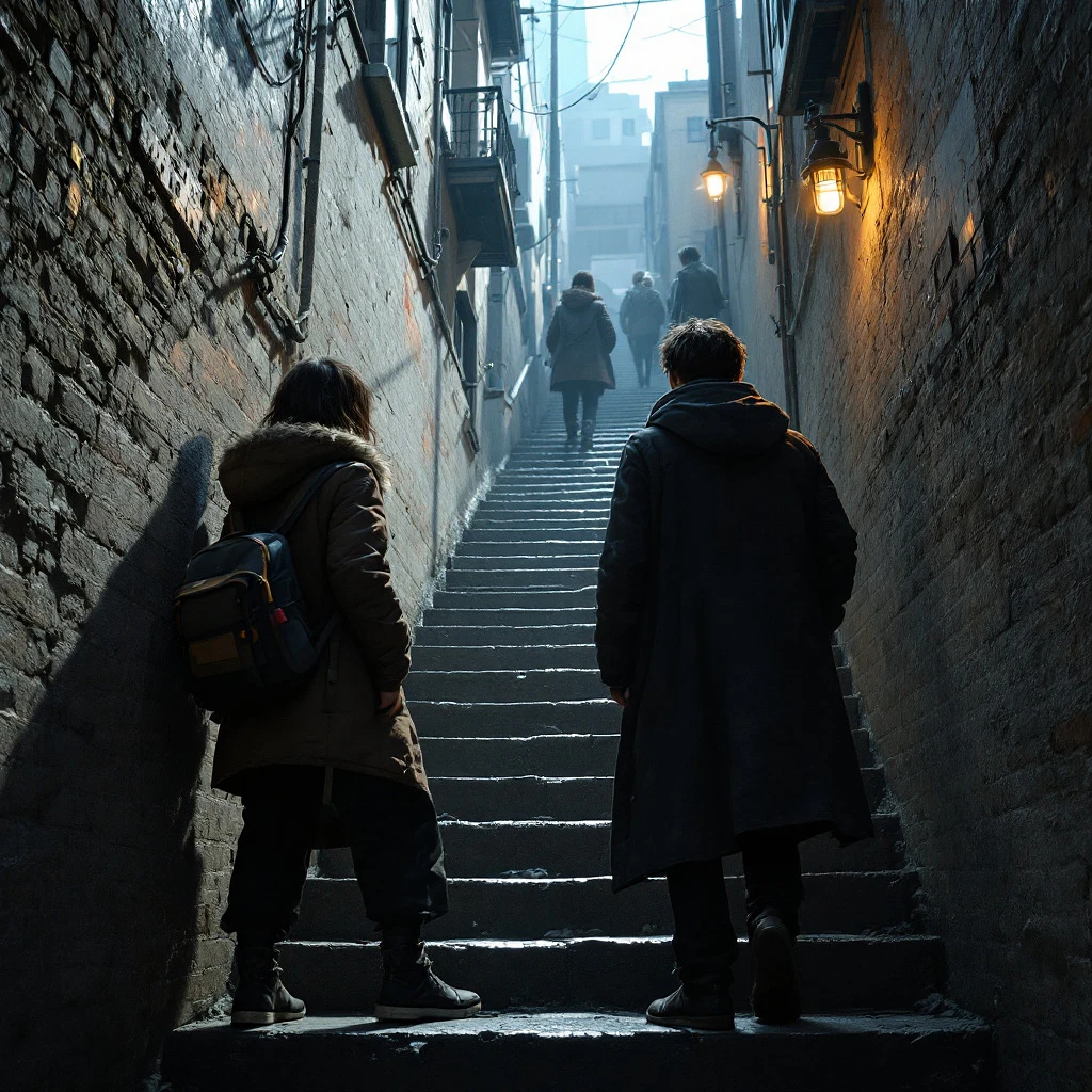 Photo of a ultra realistic friends in a tight stairway, 4k, hyper realistic, focused, extreme details, unreal engine 5, cinematic, masterpiece, art by studio ghibli, intricate artwork by john william turner
