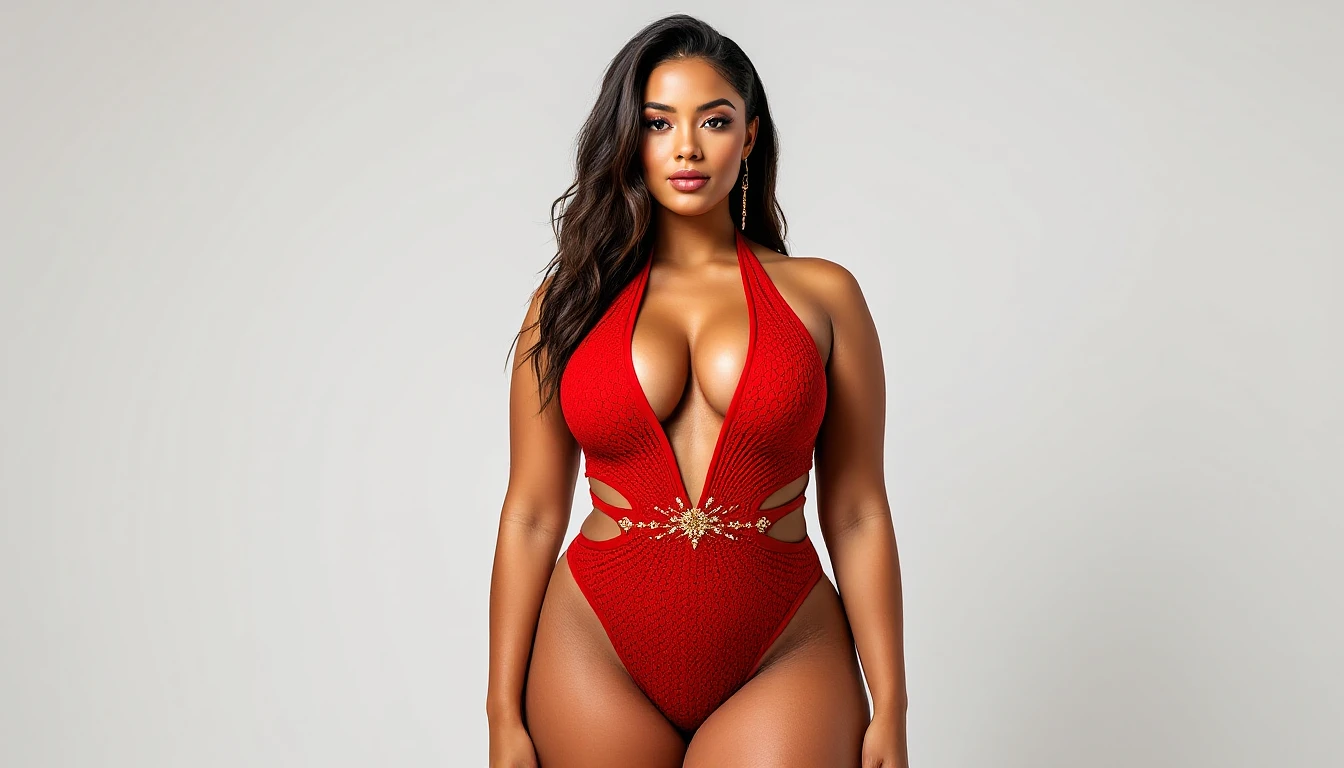 Full shot of a light-skinned woman, 20-30s, displaying a confident, neutral facial expression. She is wearing a vibrant, deep red, textured one-piece swimsuit. The swimsuit features a halter top, a deep V-neckline, and cut-out details, emphasizing her curves. Gold-toned embellishments adorn the bodice and waist. The woman's body is toned and curvaceous. She is standing in a neutral stance, her gaze directed forward. The environment is purely digital, a plain white background. Lighting is dramatic, highlighting her form with a warm tone. The composition is centered, focusing intently on the figure. The image has a sensual, yet professional style. The lighting and color scheme are highly saturated. The mood is confident and empowering. The photograph's aesthetic is contemporary, focusing on body positivity. Clean, sleek lines define the suit, creating a dynamic silhouette. The absence of any background distractions enhances the figure's prominence. The image appears to be professionally lit.