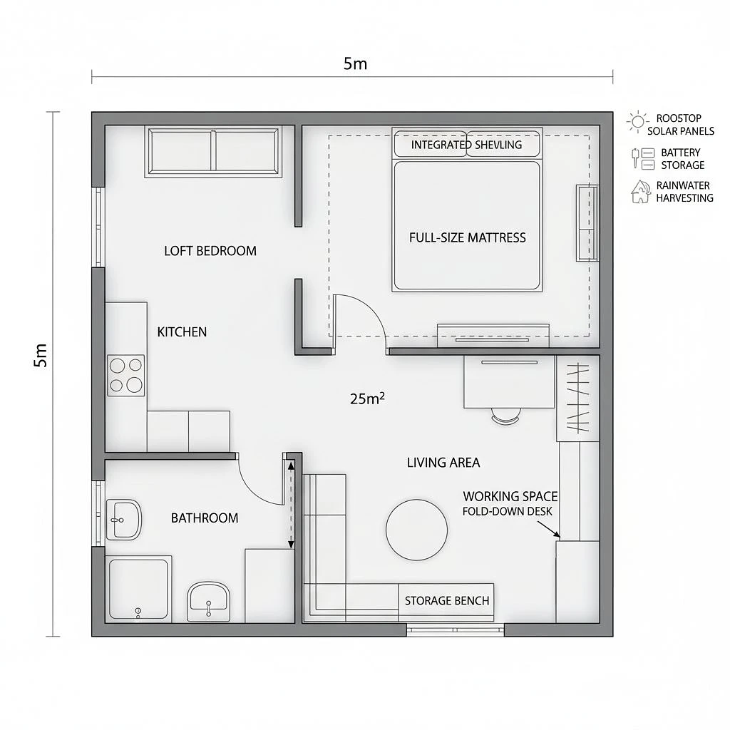The plan of a small energy autonomous house 25m². Place kitchen and bathroom on the left. The other spaces will be livingroom, bedroom, and a working space for a young couple. Open spaces, storage, loft.
