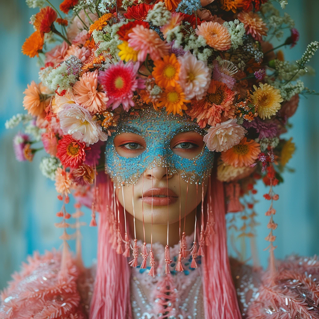 portrait photography, a woman in a glamorous makeup, wearing a mask with tassels, in the style of midsommar by Ari Aster, made of flowers, bright pastel colors, prime lense --s 550 --v 6. 0