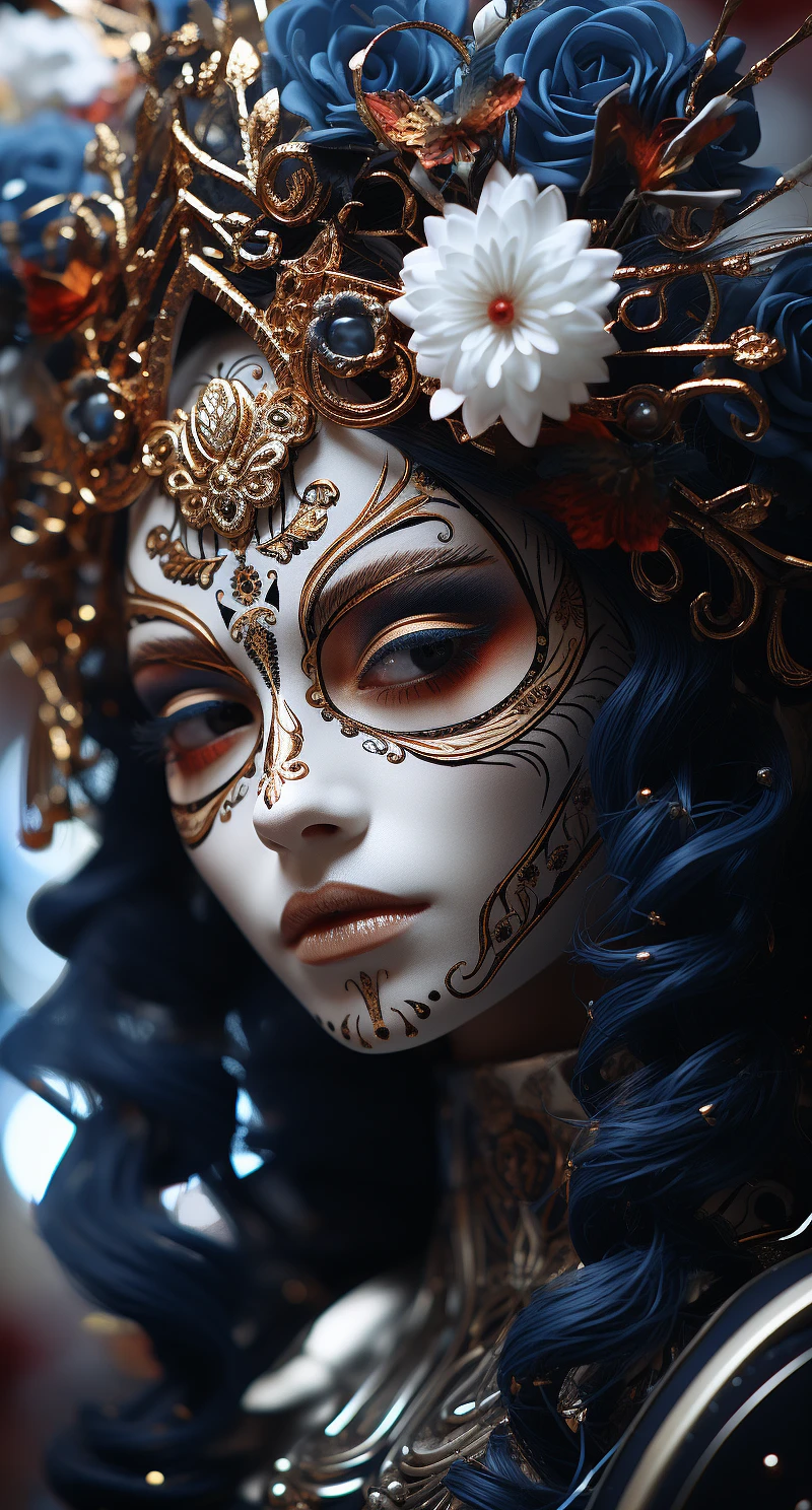 3d model of a girl with a sugar skull head, in the style of inventive character designs, close-up intensity, animated gifs, made of flowers, mexican muralism, playstation 5 screenshot, dark violet and white --ar 69:128 --s 750 --v 5. 2