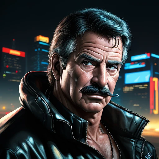 Hyper realistic Portrait of magnum Pi. Cyberpunk style futuristic. Type for action, middle of a gunfight, cinematography