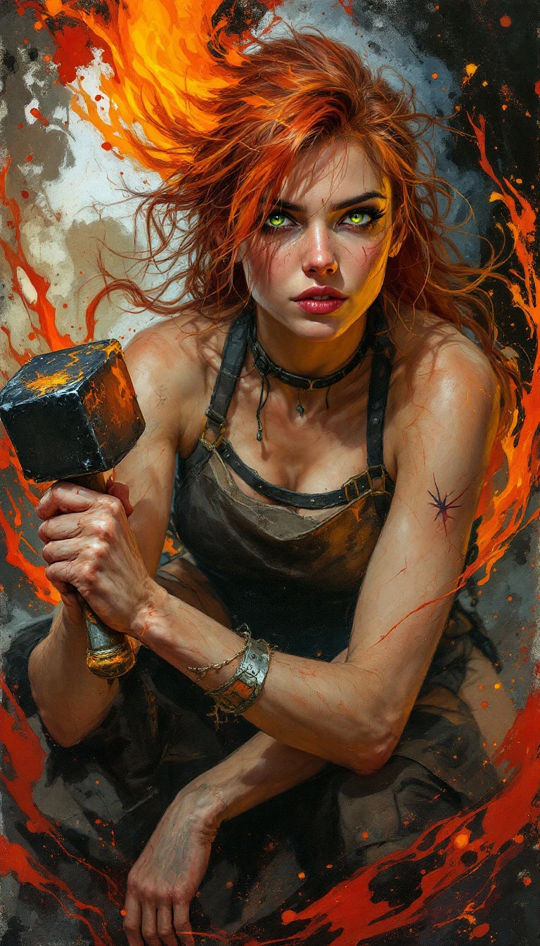 "Ember Sculptor in a Molten Crucible": A powerful abstract painting presents a sculptor, exuding both strength and a deep connection to the raw, elemental forces. She is a skilled artisan, shown within a workshop where molten materials seem to dance at her command, with tanned skin, long, flowing ember-red hair, often styled in a way that seems as though it is moving with the molten metals, and a practical, protective outfit made of leather and metal, often adorned with burn scars. Mallets, chisels, and other tools of her trade are clasped between her fingers and are woven into her protective layers. The artwork combines contemporary art with a figure representation, creating a powerful and intense scene using colors such as reds, oranges, and blacks. Her determined, green eyes, the focal point of the composition, convey both a powerful will and a love for her craft. After a long day spent shaping molten metals, the sculptor embodies both strength and a fiery artistic spirit. The swirling forms and subtle textures invite the viewer to explore the untold tales within this vibrant piece, rendered as a painting.