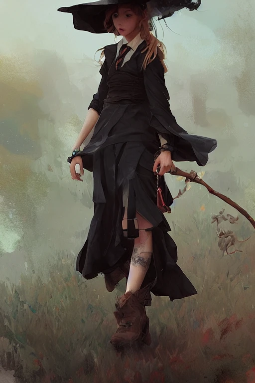 rugged girl witch wearing magic school uniform, large wide - brimmed witch hat, cinematic, elaborate, elegant, masterpiece, illustration, digital painting, concept art, trending on artstation, pixiv, art by ruan jia and hong soonsang and wlop and artgerm and greg rutkowski and alphonse mucha