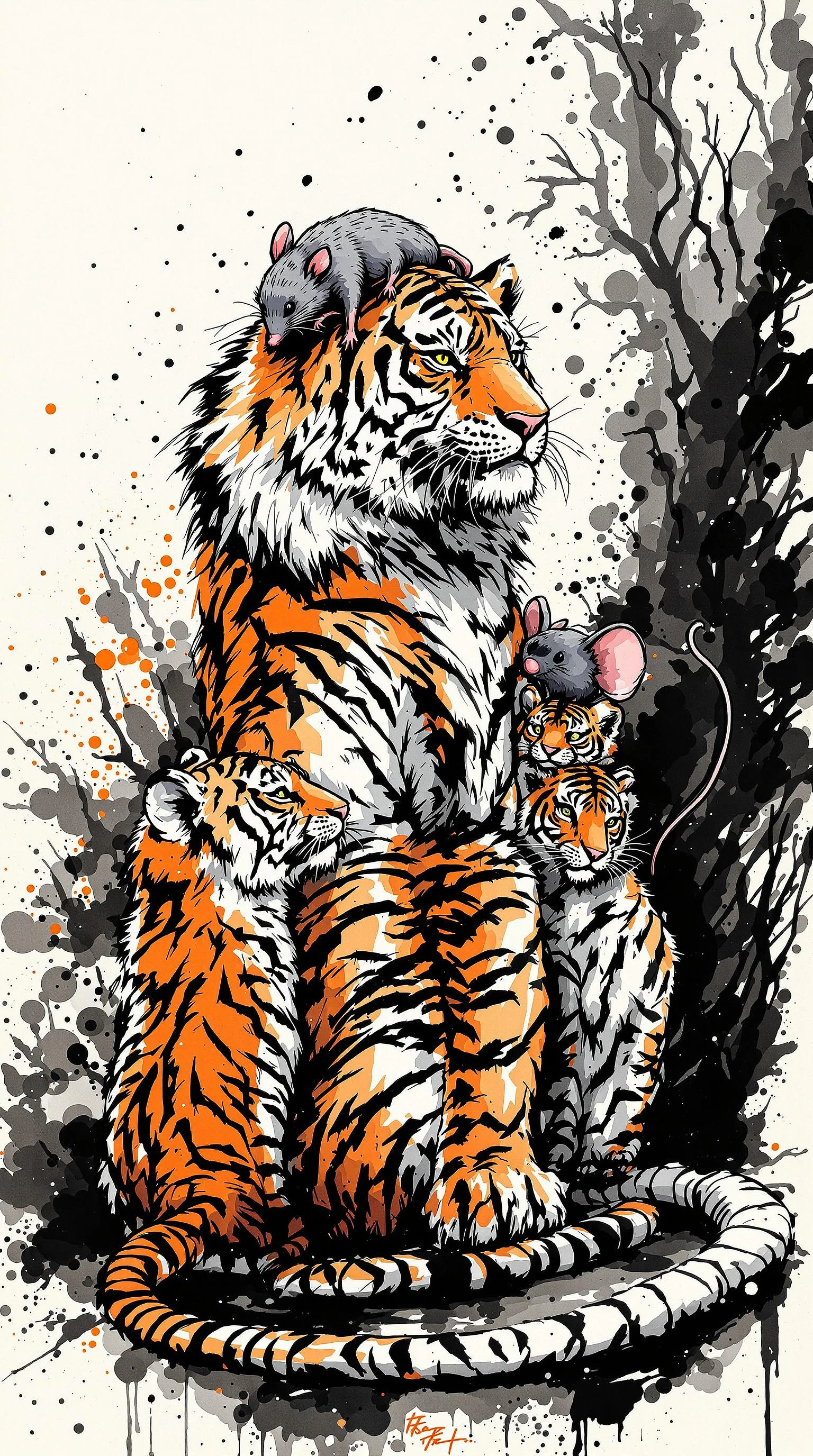 a tiger and two tiger cubs, and a oversized mouse, ferocious, detailed, full-body shots, ink style, Ink splash art on the background, ink style, The whole is on the right,Ink wraps around the body, and the ink obscures the subject, The rat sits on the back of the subject