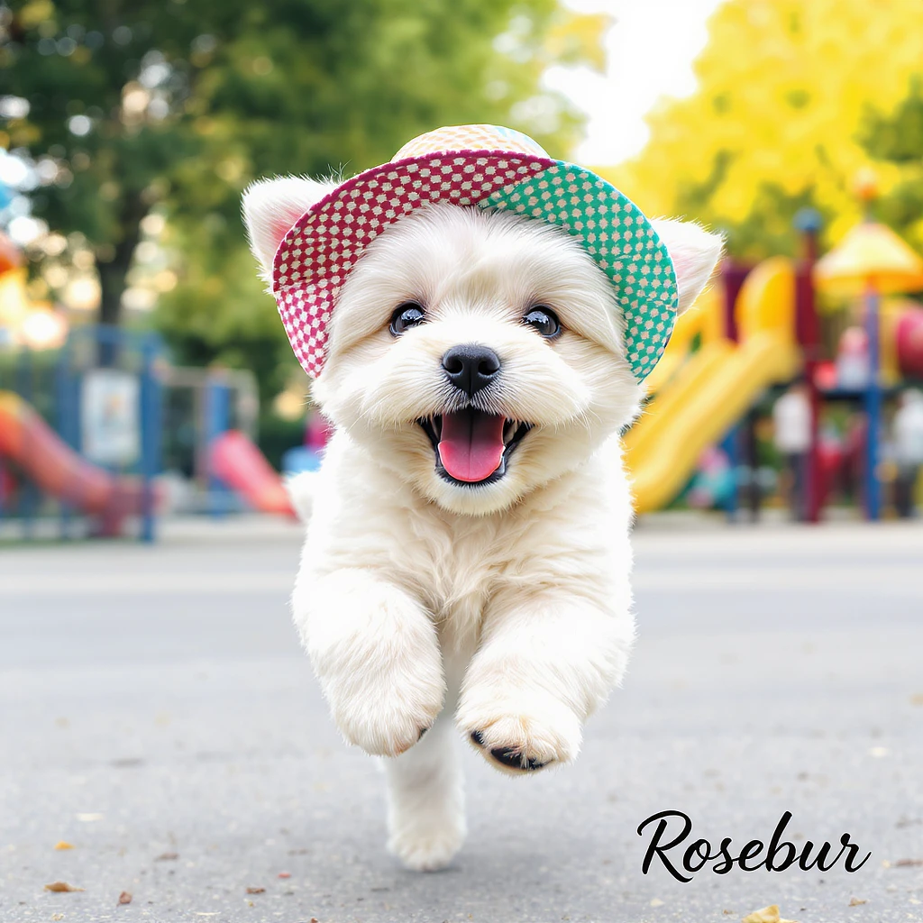 A joyful maltese puppy full of friendly energy, leaping towards the camera and wearing a colorful hat in a dog park. The white background highlights the puppy's exuberant expression and dynamic pose, focusing on its playful and inviting eyes. With 2px cursive font text 'Rosebur' in lower right corner.