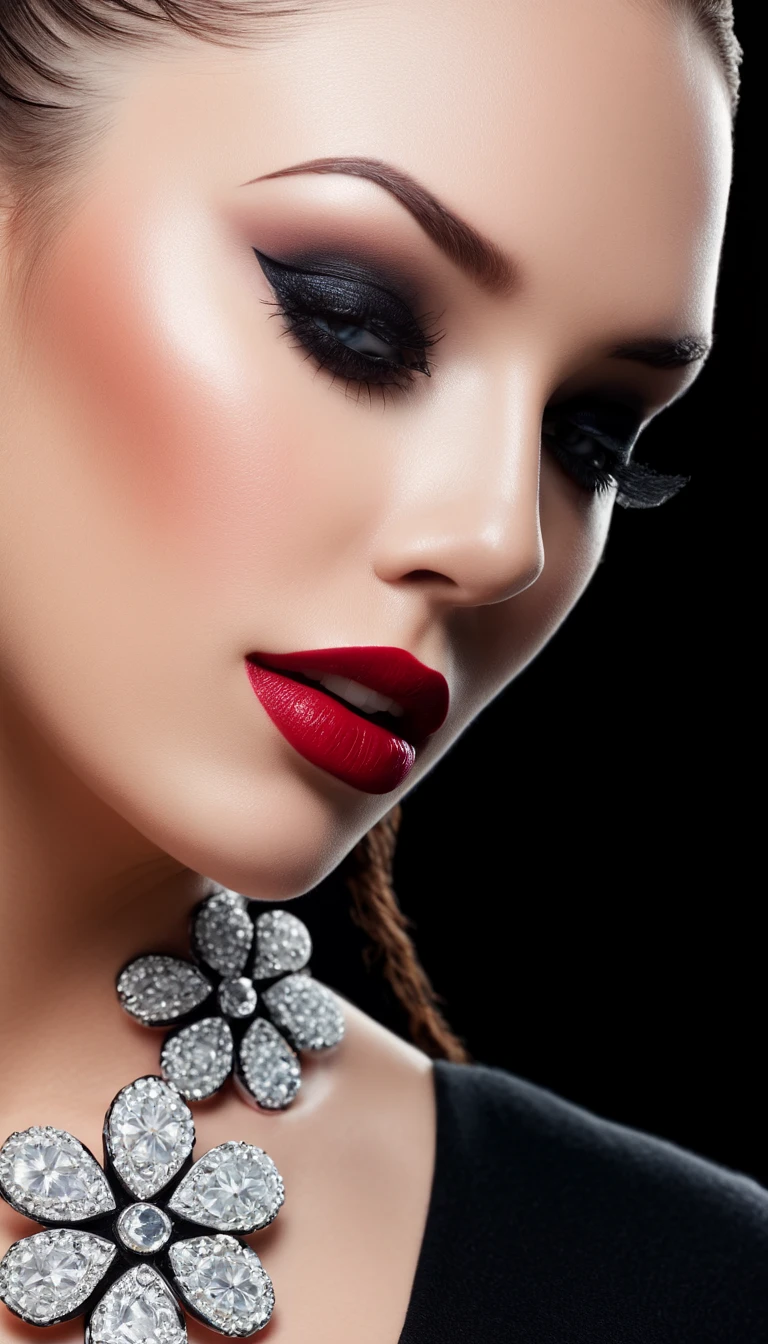 The image features a woman with long hair and a red lip, wearing a black top and a necklace. The woman appears to be a model, and the photo is likely taken in a studio setting. The combination of her makeup, attire, and the big necklace gives her a stylish and elegant appearance. (controlnet_mode:canny sdxlYamersRealism2, sdxl-1.0.0.9.safetensors, SeargeSDXL4.2-Llama2 prompt)