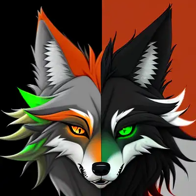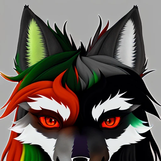 wolf-like fursona with 4 different eyes, with all of them containing an ombre of the colors green, orange, and a miniscule amount of red. The rest of the body and fur only consisting of black and dark gray, with four ears instead of two.