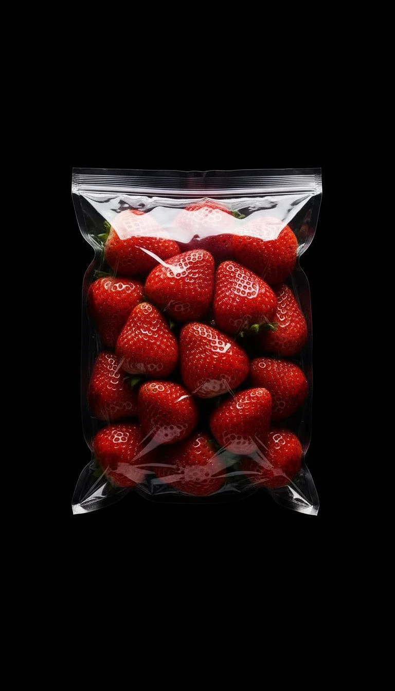 a photograph of a vacuum-sealed bag filled with fresh strawbery studio photography of products, hyper-realistic textures, hard plastic glare, soft studio lighting, central composition, high detail, shot with a 50mm lens, shot at eye level, black background, modern and stylish composition, high resolution High-contrast, deep black color. The picture was taken in Canon EOS R5 style at F2 ISO 30