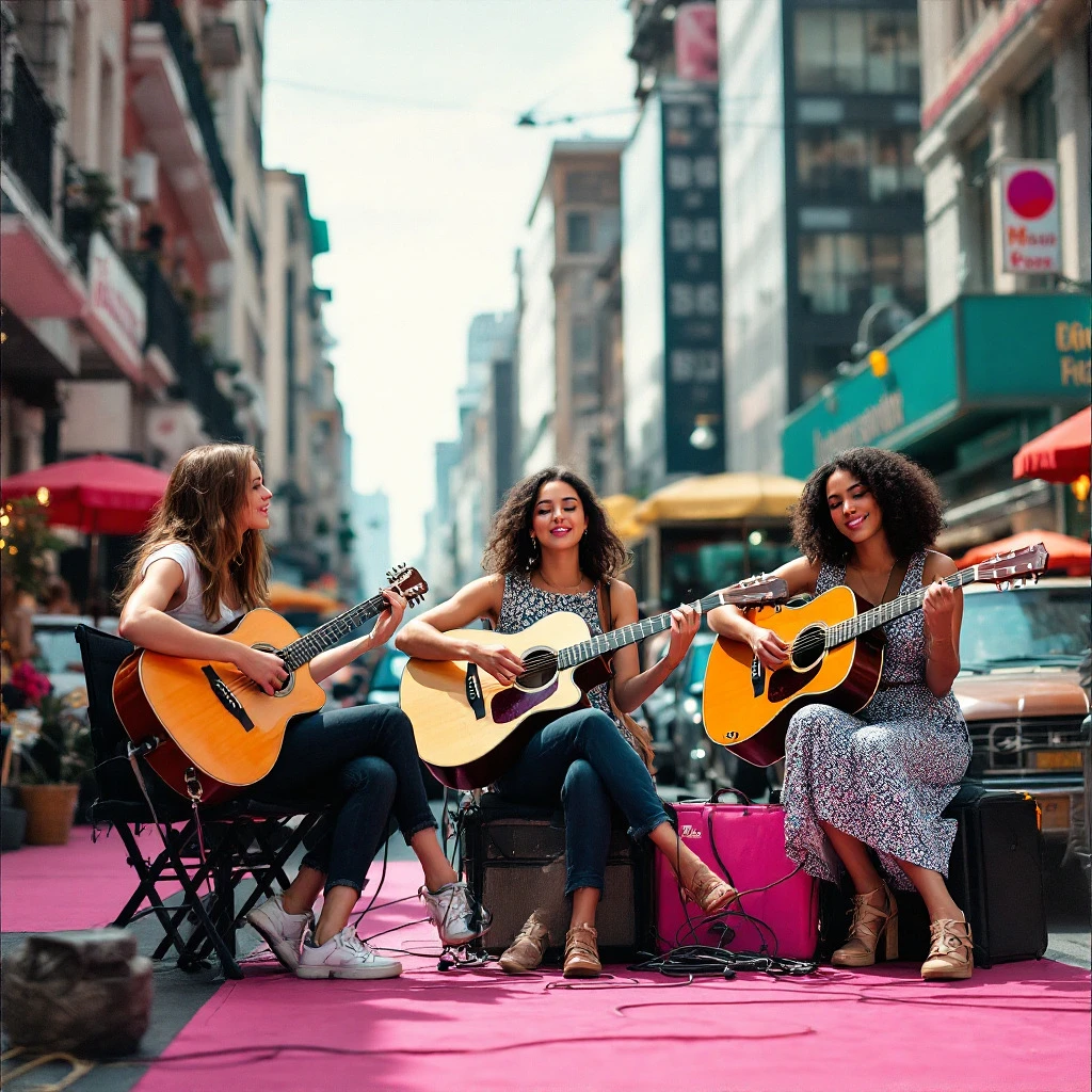 A photograph of three girls playing music on the street in the style of Pop Art with a medium aspect ratio