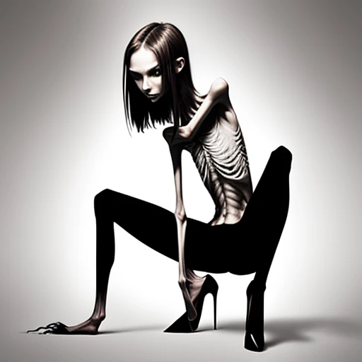 squatting position of extreme skinny slender anorexic girl very skinny slender girl, with long curved claws, skinny legs and long skinny calves in high heels,