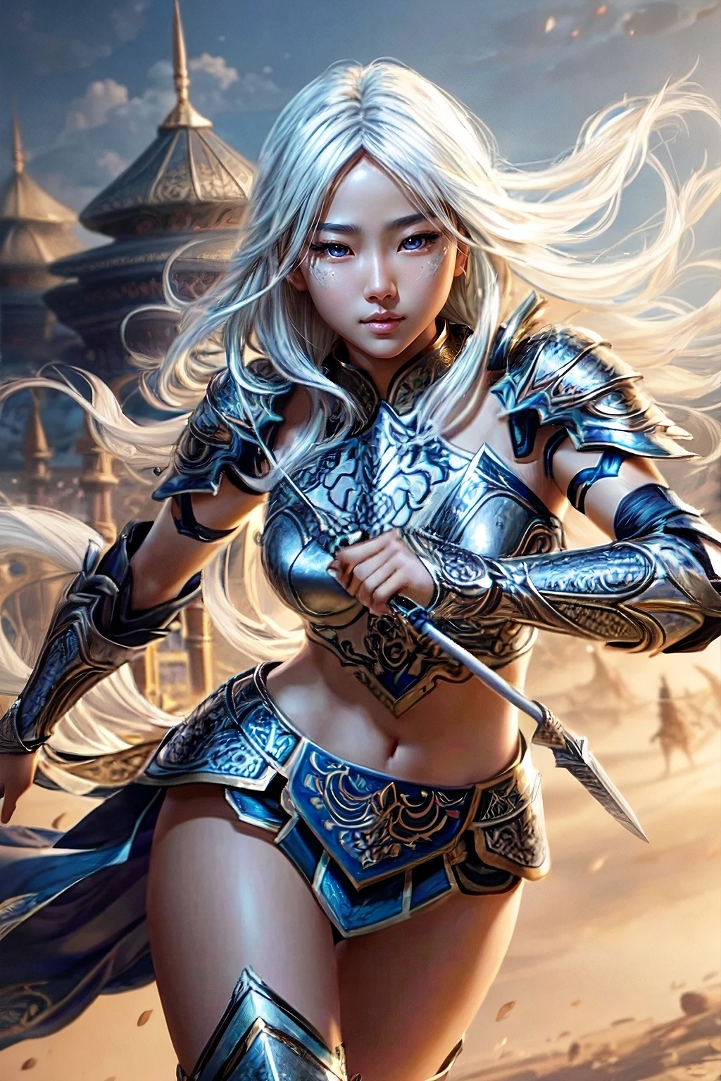 beautiful young asian girl warrior, detailed gorgeous face, beautiful eyes, full body, olive skin, medium length white hair, revealing armor, Hyperrealism, intricate, elegant, cinematic lighting, highly detailed, illustration, digital art, digital painting, masterpiece, breathtaking, raytracing, stunning environment