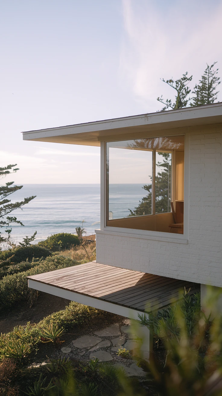 Hyper realistic eye level exterior photo of a mid century modern style house overlooking the ocean, daylight, indirect lighting, AD magazine, Frank Lloyd, Eames, Mies van der Rohe