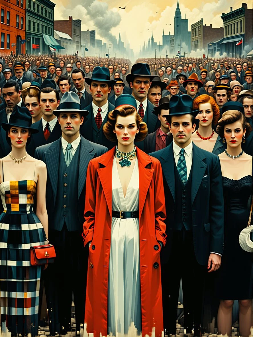 a fashion-diverse crowd of men and women stand together facing the viewer. it is the 1930's. The background is a dystopian scene of a run-down city though the crowd is not dressed shabbily. The scene has a flair of the work of Edward Hopper or Rene' Magritte.