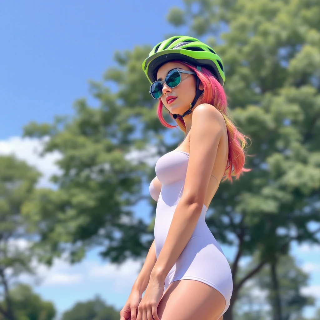 woman, bicycle helmet, sunglasses, bodysuit, shorts, <lora:b1keg1rl-v1:1> , petite, breasts, breast focus, 1girl, underboob, sideboob, braless, white bodycon dress, park, sky, trees, vivid hair