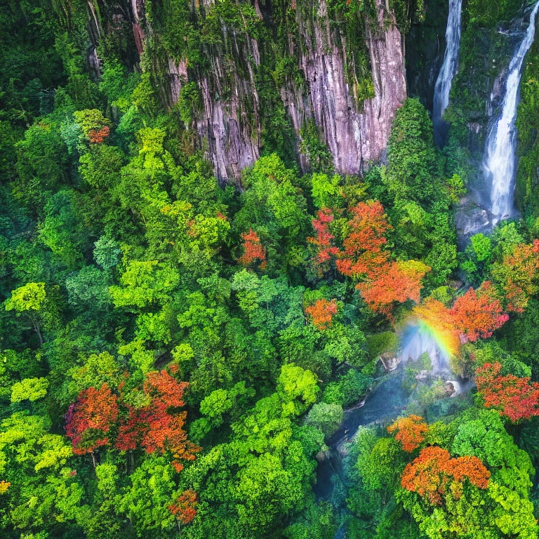 magical faewild forest city surrounded by cliffs and waterfalls with multicolor trees, massive tree in the center