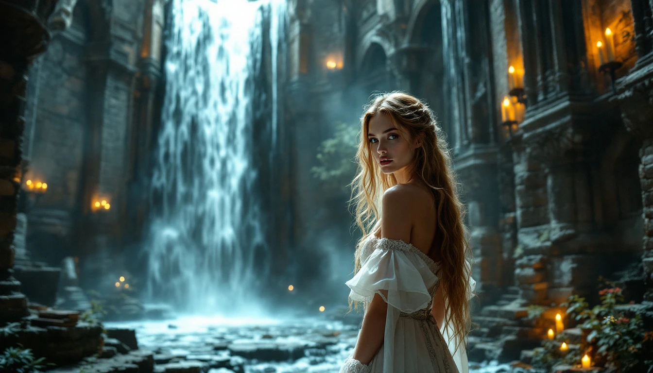In the heart of a grand, gothic medieval master bedroom, a woman stands majestically by a cascading waterfall, her presence illuminated by the soft, ethereal glow of candlelight. Her long, golden locks cascade down her back like a river of sunset hues, framing her porcelain skin and accentuating her striking features. Her attire is a vision of elegance, a flowing white gown with intricate lace details and a delicate silver belt that cinches at her waist, creating a silhouette that is both statuesque and feminine. The room itself is a masterpiece of medieval architecture, with towering stone walls adorned with cobweb-covered tapestries and a vaulted ceiling that seems to stretch up to the heavens. The air is thick with the scent of old books and dust, and the sound of the waterfall creates a soothing melody that seems to wash away all worries and cares. The lighting is dim, with only a few candles flickering to cast shadows on the walls, creating an atmosphere that is both intimate and mysterious. The camera perspective is one of reverence, capturing the woman from a low angle as if to emphasize her statuesque beauty. The style is one of classic elegance, with a focus on capturing the intricate details of the room and the woman's attire. The camera used is likely a high-end digital SLR, with a wide-angle lens to capture the grandeur of the room and a shallow depth of field to blur the background and emphasize the subject. The overall effect is one of timeless beauty, a moment frozen in time that seems to transcend the ages.