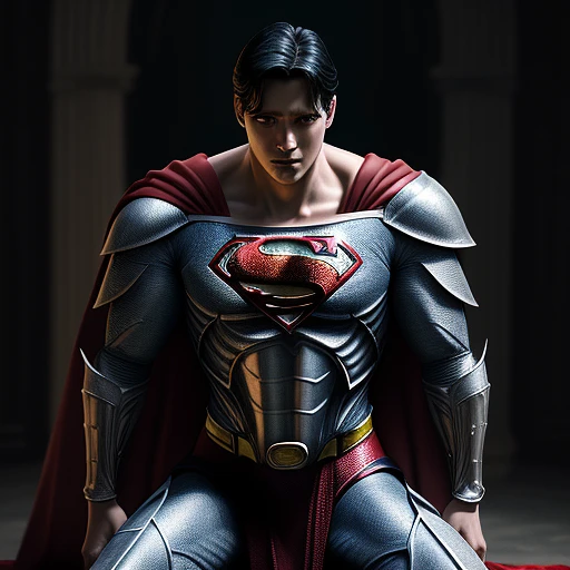 kneeling superman but dog knight, portrait, finely detailed armor, intricate design, silver, silk, cinematic lighting, dramatic lighting, 4k