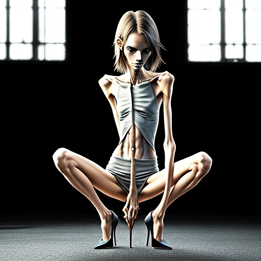 squatting position of extreme skinny slender anorexic girl very skinny slender girl, with long curved claws, skinny legs and long skinny calves in high heels,