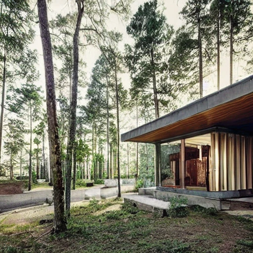 a hyper realistic photo of a beautiful house where walls are made of windows in mid-century modern style at day time inside of a forest and full of trees and plants