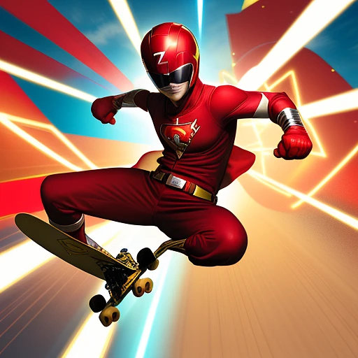 a red suited superhero, with a power ranger helmet baseball cap backwards, wearing sunglasses, gold boots and gold gloves, WITH A WHITE ZOZ LOGO ON HIS CHEST riding on a skateboard, flying off a skate ramp like a rocketship superhero.