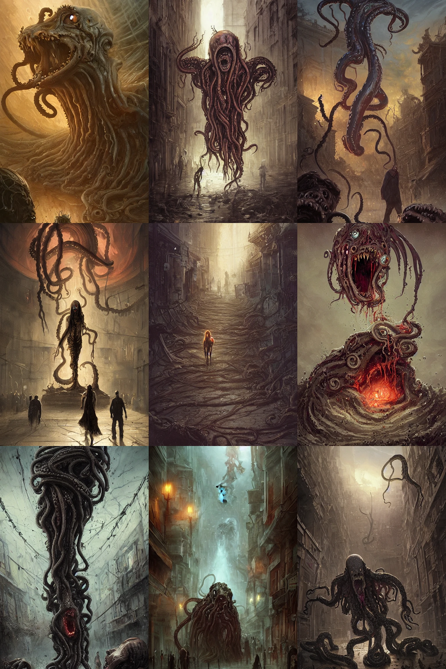 a horrible tentacle demon emerges from a corpse. people watching scream in agony and fear. a crowd flees. illustration. by greg rutkowski and kinkade, daytime, roadside, natural stone road, middle eastern style vendors, elegant, architecture, sharp focus, vibrant and vivid, smooth, cinematic, 4 k, trending on artstation, archviz, hyperrealistic, dof