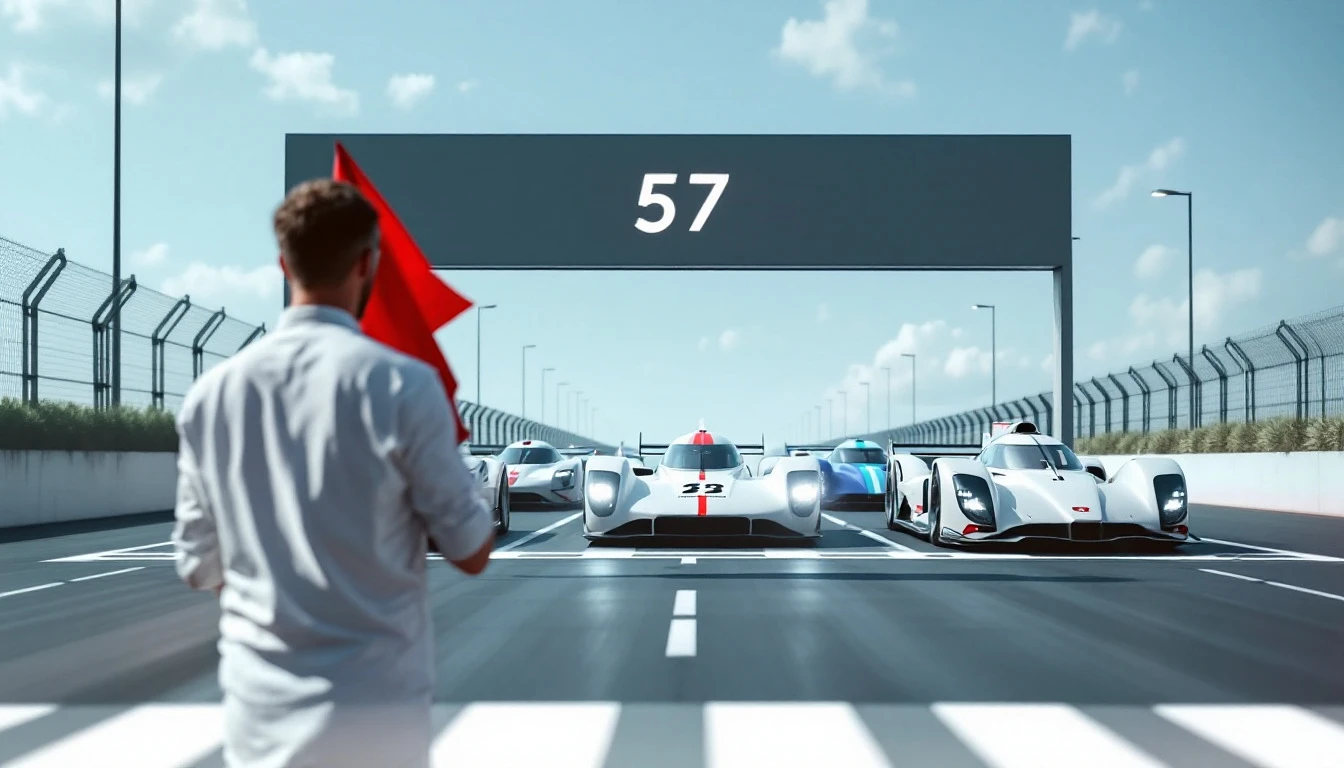 There are 5 racing cars at the starting line. Ahead of the starting line, behind the cars, stands a man in a white sports shirt, without a headdress, with a whistle and a red flag. A man whistles and waves a flag. The camera looks from the other side of the road, in front and slightly above, at 5 racing cars standing on the track at the starting line and at a man with a flag, facing towards the camera and cars Style - cyberpunk