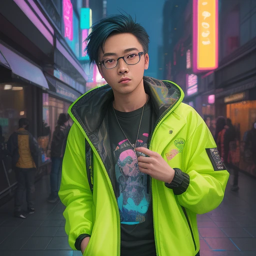 an image of a men in a neon jacket standing somewhere, in the style of ross tran, gadgetpunk, street scene, charming anime characters, jessica drossin, hyper-realistic details, hikari shimoda, Fujifilm X-T4, Sony FE 85mm f/1. 4 GM --q 2 --s 750 --ar 3:4 --style raw --v 5. 1 --q 2 --s 750 --style raw