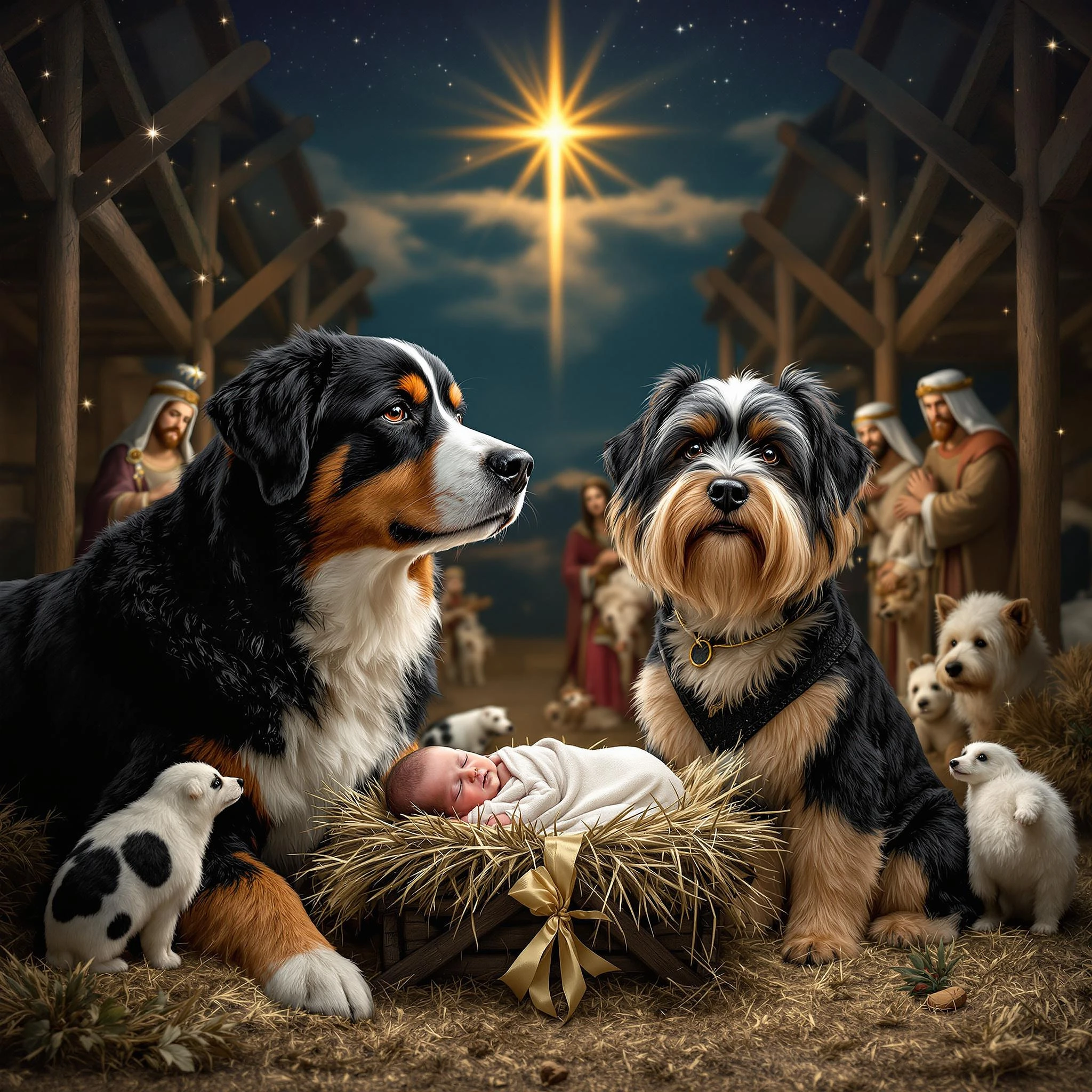 a Bernese mountain dog and a Yorkshire terrier implanted into the background of the traditional baby Jesus manger scene with all the wise men, farm animals and Mary and Joseph