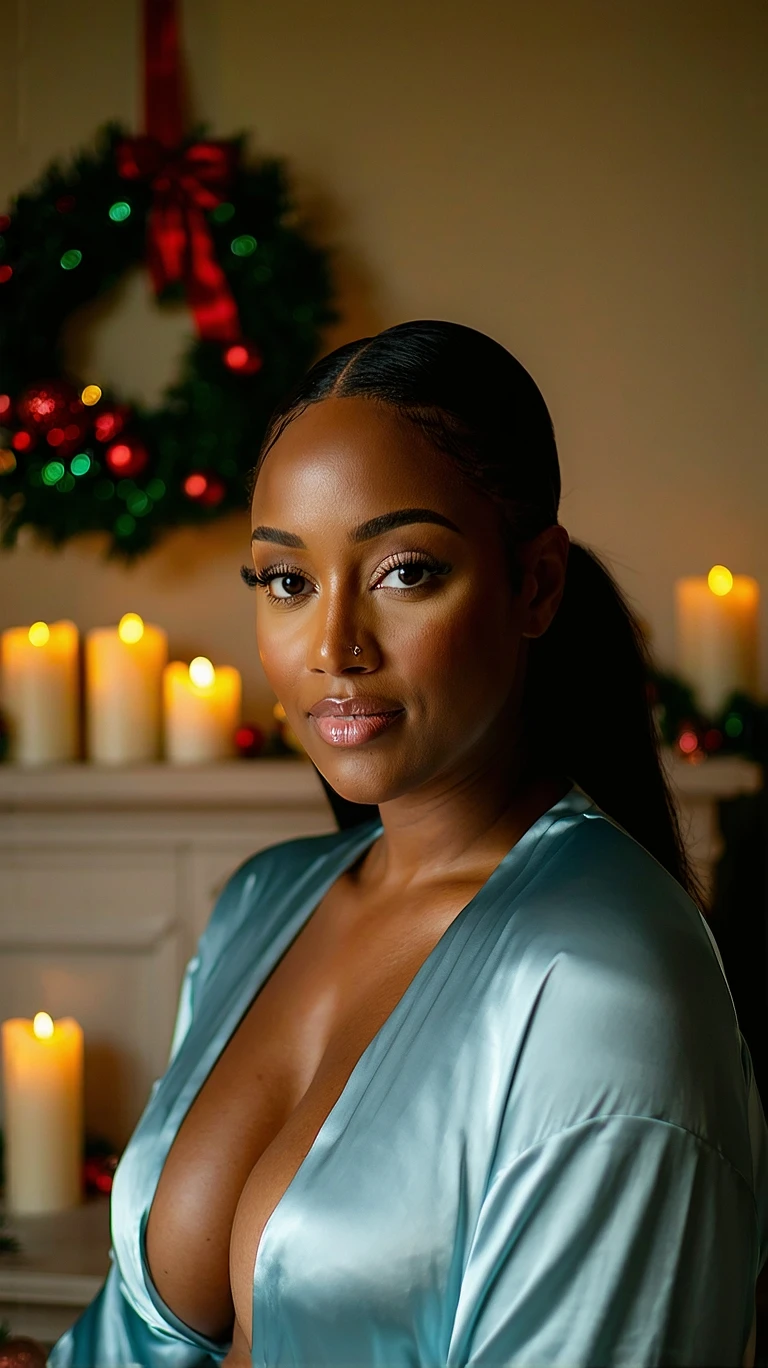 30 years old black woman, centered in the image, is captured in a close-up, slightly low-angle shot. Very beautiful face with real skin imperfection. She is wearing a light-blue, soft-textured robe, which reveals her upper chest. Her body type appears curvaceous. The setting is a dimly lit interior, with a warm, glowing light source enhancing her features. Multiple warm-toned candles are visible in the background, along with a festive Christmas wreath featuring red, green, and white decorations.  The background is out-of-focus, drawing attention to the model and creating a warm, intimate atmosphere. The lighting is focused on the subject, casting soft shadows and highlighting her features.   The overall style leans toward fashion portraiture, with a hint of holiday festivity. The composition is intentionally close-up, emphasizing the model's beauty and alluring characteristics. The image features a soft, neutral background that appears to have a warm tone. There are some details on the left side, suggesting texture or depth, which may indicate hair or clothing. Overall, the image has a calm and intimate atmosphere.