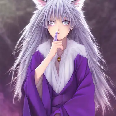 a happy beautiful white-haired anime wolf girl wearing purple kimono, wavy hair, anime, beautiful face, portrait, soft lighting, blur, flare, detailed accessories, graceful pose, detailed face, detailed kimono, detailed Japanese building background, hyperdetailed, masterpiece, 4k, 8k, trending on pixiv