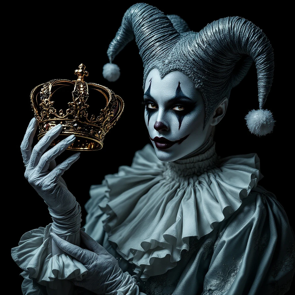 A photograph of an elegant jester holding a crown in his hand, against a black background, with text "proart", and white and dark grey makeup, white gloves with ruffles, in the style of hyper realistic photography, with cinematic light, ultra-detailed, with intricate details. --s 750 --v 6. 0 --style raw --ar 14:25