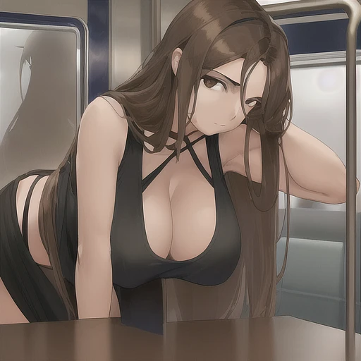 a woman, long brown hair, beautiful face, black tank top, large bust, bending down slightly, super realism, 8k, alot of cleavage, inside of a train