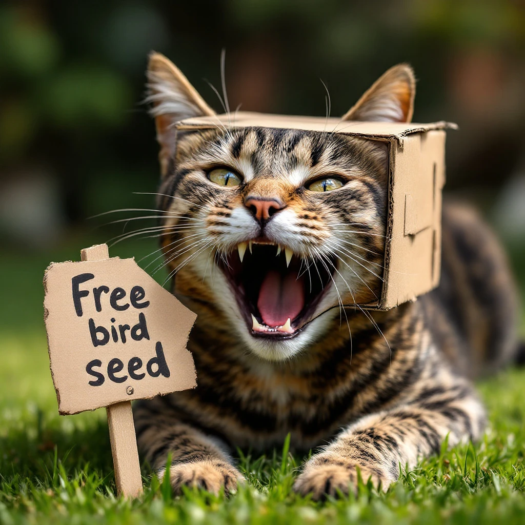 Create a photorealistic image of a brown tabby cat resting his chin on his paws on a green lawn. He has a fake cardboard storefront attached to his nose, with his open mouth serving as the entrance to the fake store. There is a sign pointing to his mouth, written in crude lettering on cardboard, with the words 'Free bird seed'