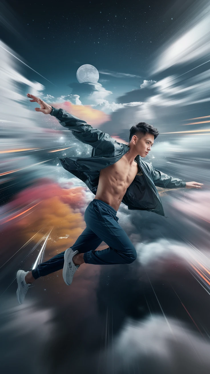 A fast aerial tracking shot from the perspective of a drone captures a surreal dream sequence of a handsome Malay man in his 30s, wearing modern athleisure attire, flying at high speed in a prone position. He effortlessly glides between the clouds, his body fully extended with arms stretched out to the sides, legs slightly apart, and his face looking straight ahead, capturing the sensation of smooth horizontal flight. His loose-fitting jacket and pants billow in the wind as the camera closely tracks from a slightly higher angle, moving from left rear to right rear, maintaining a continuous view of his front-facing position as he swiftly traverses the scene. The environment is dynamic and rapidly changing, with colorful clouds below, white clouds streaking by in the background, a large moon hanging high in the distance, and a sparkling night sky surrounding him, with motion blur and light trails enhancing the sense of speed and fluidity. Rapid movement