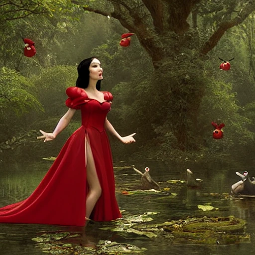 film still of Monica Bellucci as snow white, red dress in a forest by a pond with frogs, by artgerm, makoto sinkai, magali villeneuve, Gil Elvgren, Earl Moran, Enoch Bolles, symmetrical,