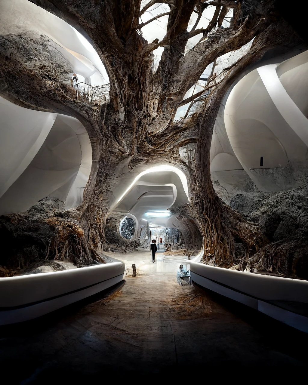 large interior of beautiful underground spaceship growing out of roots of epic tree, peaceful scene, White interior, trees, people, hyper detailed, futuristic, --ar 4:5 --q 5