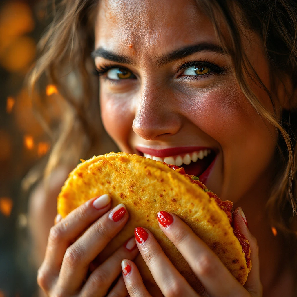 A pretty girl chewing on a very spicy, hot and big taco with a extremely high Scoville count, it makes him squint and sweat, his eyes wet and red, we can almost taste the spicyness, challenging mixed media taco restaurant advertisement