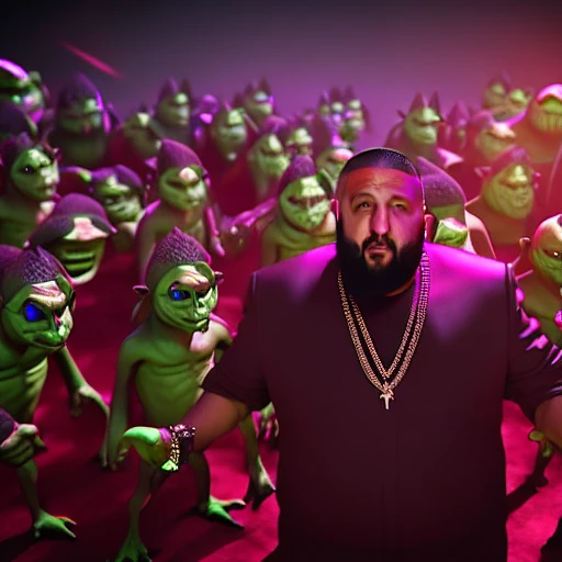 DJ Khaled surrounded by evil goblins, 8k, ultra realistic, nanites, 3D, volumetric lighting