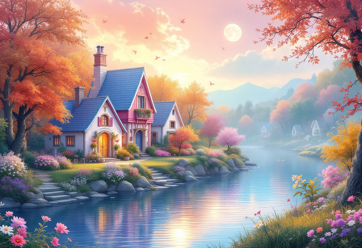 A serene scene features charming cottages with colorful rooftops beside a tranquil river. Surrounded by vibrant autumn trees and flowers, the moon casts a soft glow over the idyllic landscape. in a vibrant, dreamy visual style characterized by soft pastel gradients that transition seamlessly between pinks, purples, blues, and yellows. Incorporate a luminous, ethereal atmosphere with a subtle glow emanating from focal points. Distribute colors evenly, but emphasize soft highlights and gentle contrasts to create depth. Use delicate, flowing lines and soft textures to enhance the sense of serenity and whimsy. Mix reflective surfaces, translucent elements, and layered compositions to evoke a harmonious balance between light and shadow. Add intricate details with a focus on organic patterns and flowing curves to complement the soft, soothing aesthetic.