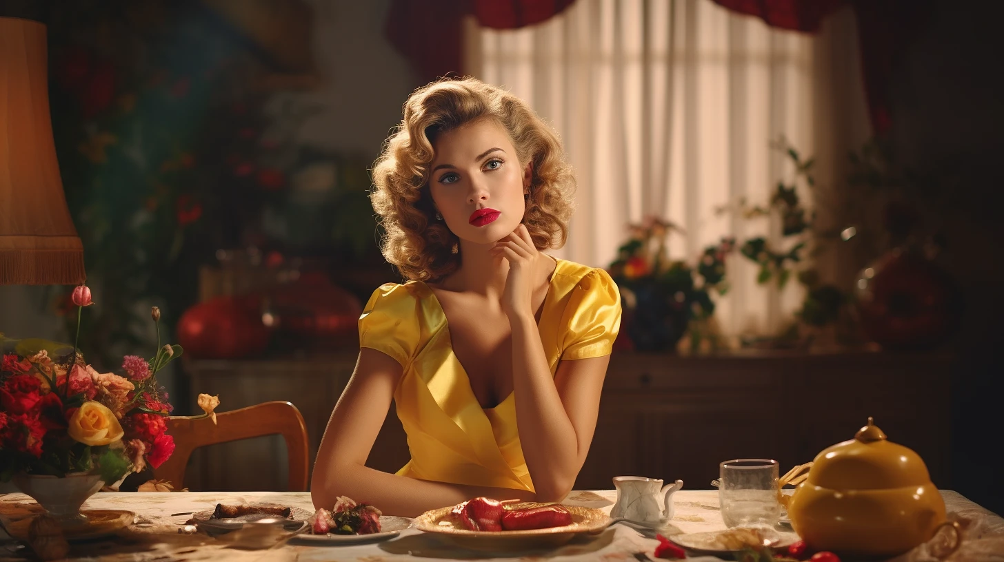 Lofi photography, pristine housewife eats dinner alone, world falls apart around her while she is untouched, 1950s, bright colors, messy background, realistic skin, mood lighting