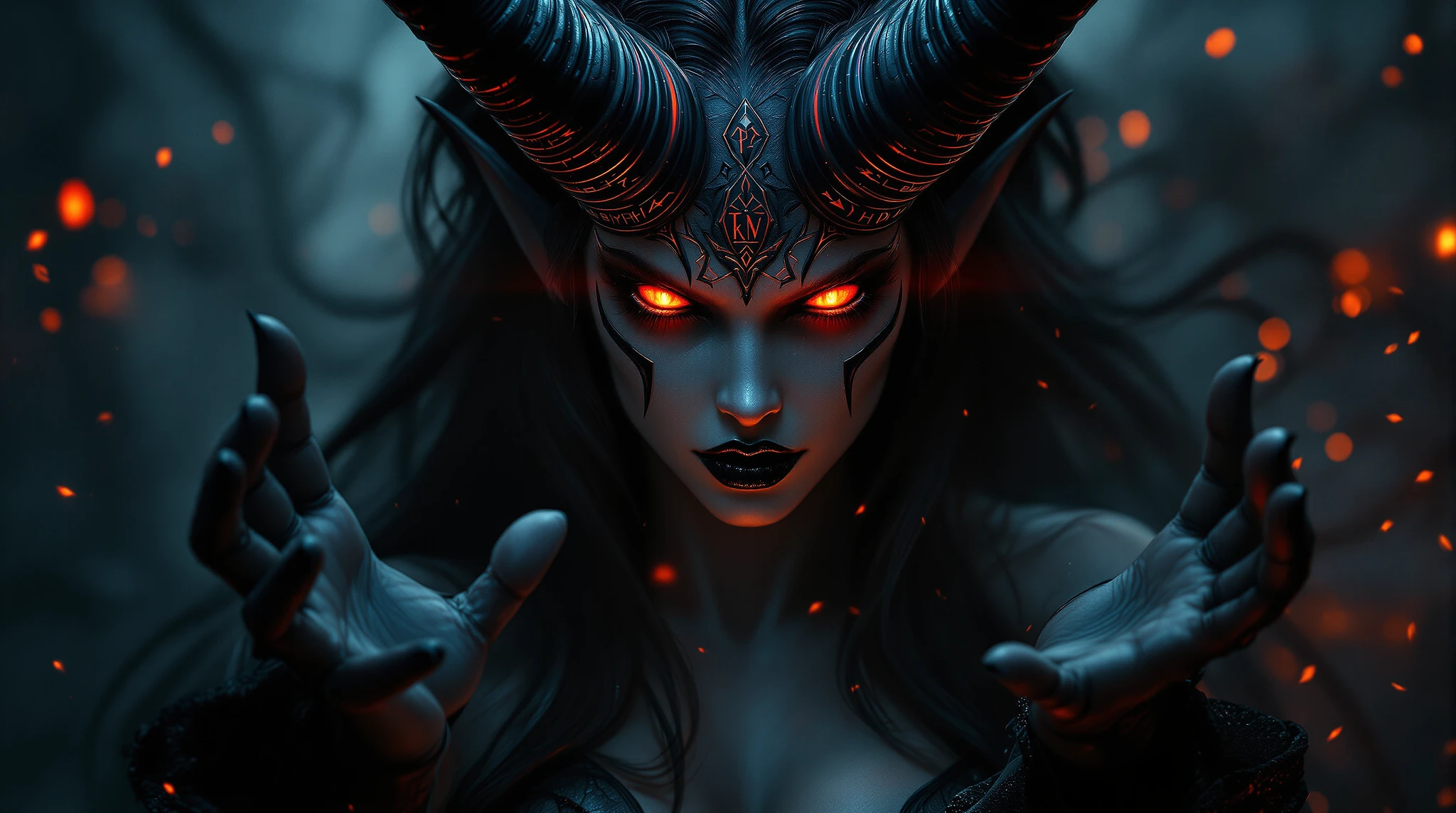 A seductive female demon in a dramatic portrait, reminiscent of Beksiński's dark mysticism. Her face has sharp features with glowing red eyes and black lips, with both hands raised in a demanding "give it to me" gesture, palms up and fingers slightly curled. (We can bearly see her cleavageCurved obsidian horns emerge from her forehead, with the same intricate runes as 'Taste of Darkness'. Her expression is commanding yet seductive. Long dark hair flows like liquid shadows. (bare shoulders) The lighting is dramatic with deep shadows and ember-like highlights, focusing on her face and beckoning hand. Dark mist and ember sparks swirl in the background. The color palette maintains deep blacks, rich crimsons, and subtle blue undertones. Her skin has the same ethereal blue-tinted quality. Cinematic composition with professional lighting. 4k, hyper realistic, focused, extreme details, unreal engine 5, cinematic, masterpiece, art by studio ghibli, intricate artwork by john william turner