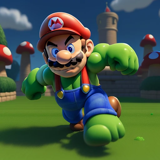 Super-Mario running but hulk, Mushroom Kingdom background, 32k, closeup, trending on poltcount 3D, game --v 5. 2 --ar 2:3 --s 700 --q 2