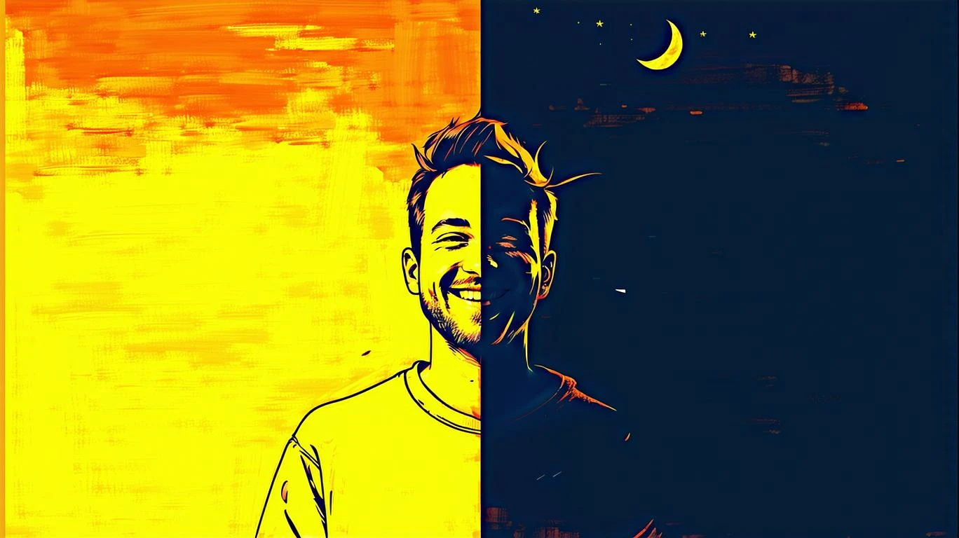 Half the screen is day, and half is night. Where it's summer, the man is smiling. Where it's night, the man is sad. The style is hand-drawn. Yellow and orange colors predominate, with a black outline.