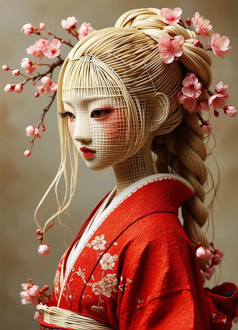 The most beautiful Japanese straw doll woman made of thin straw, straw hair, cherry blossom in hair, woven straw face , red straw kimino, detailed, hyperrealistic, 8k