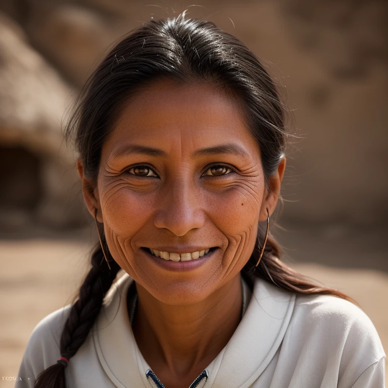 hyper realistic headshot photo of a 40 year old Quechua woman, slim, skinny, looking into the camera, smiling slightly, ultrarealistic, soft lighting, 8k