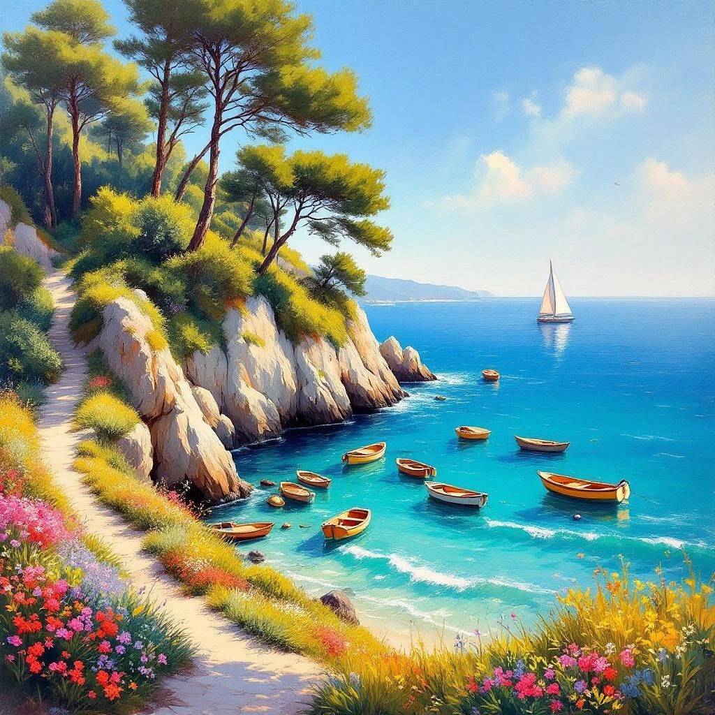 A vivid, impressionistic landscape painting in South France of a bay on the Mediterranean Sea. The scene features rocky cliffs adorned with lush greenery and a small path, vibrant wild flowers and tall pine trees bending towards the sea under a clear blue sky. Small boats rest in the clear, turquoise water, with gentle waves creating a sparkling effect. In the background, a sailboat drifts calmly, completing the peaceful and idyllic coastal setting. The brush strokes are strong and expressive, with warm colors that capture the sunlit atmosphere and mix realistic textures with a soft, painterly style