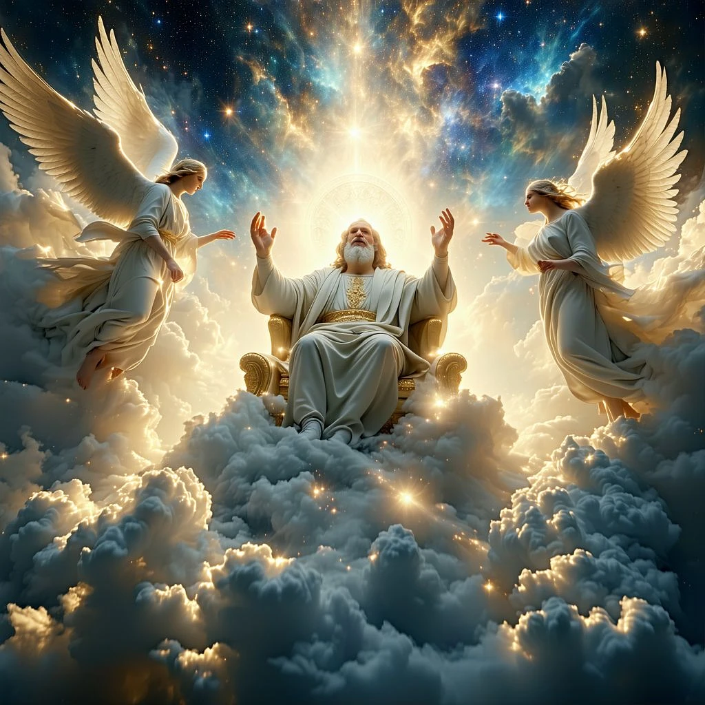 An 8K image with maximum quality and an advanced level of detail, in a realistic, cinematic style, depicting heaven. The celestial setting should include elements such as ethereal, radiant clouds, a divine light emanating from a majestic throne, and angels in resplendent costumes, hovering gracefully. God, at the center of the image, should be portrayed with an aura of golden light, with details reflecting wisdom and benevolent power. The background should include vast starry skies and heavenly landscapes that evoke a sense of infinity and peace. The lighting should be soft and celestial, highlighting divine majesty and splendor. Every detail, from the texture of the clouds to the sparkle in the angels' eyes, should be crafted to create an atmosphere of reverence and divine glory. --v 6. 1