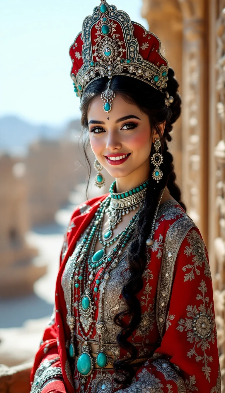 /imagine prompt: A smiling, beautiful young woman dressed in a traditional Turkmen royal outfit, with intricate silver embroidery on a vibrant red silk dress and a tall ornate headdress with silver and turquoise jewels. She is adorned with heavy silver Turkmen jewelry, including necklaces and rings, with piercing dark eyes. The background features the ancient city of Merv, natural lighting, cinematic photography, and sharp focus. --ar 85:128 --v 6. 0 --s 250